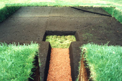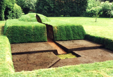 "Utgrävning - minne av Gaia", arkitektonisk trädgårds gestaltning, Hammenhög, Svalöf Weibull, Skåne, 1998. - Dokument skisser finns i Lund på Skissernas museum.
